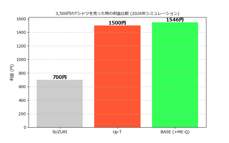 ※BASEは送料込みの総額(4,000円)に対し手数料6.6%+40円がかかるため、意外と手数料が重くなります。しかし、原価の安い工場(ME-Qなど)を使えば、Up-Tと同等以上の利益が出せます。